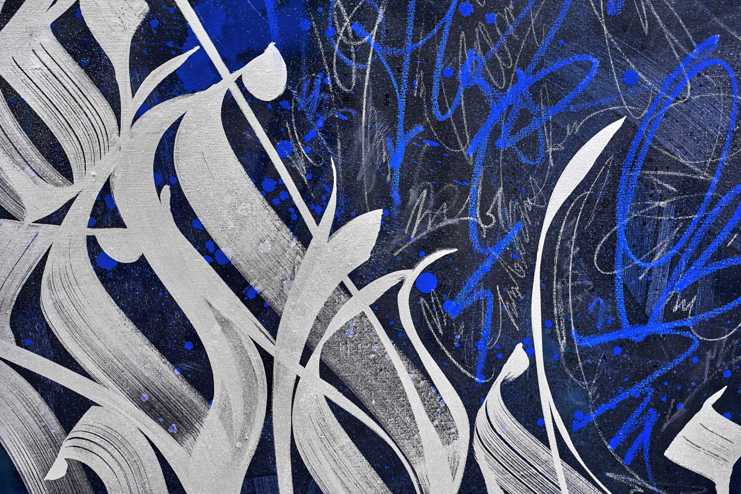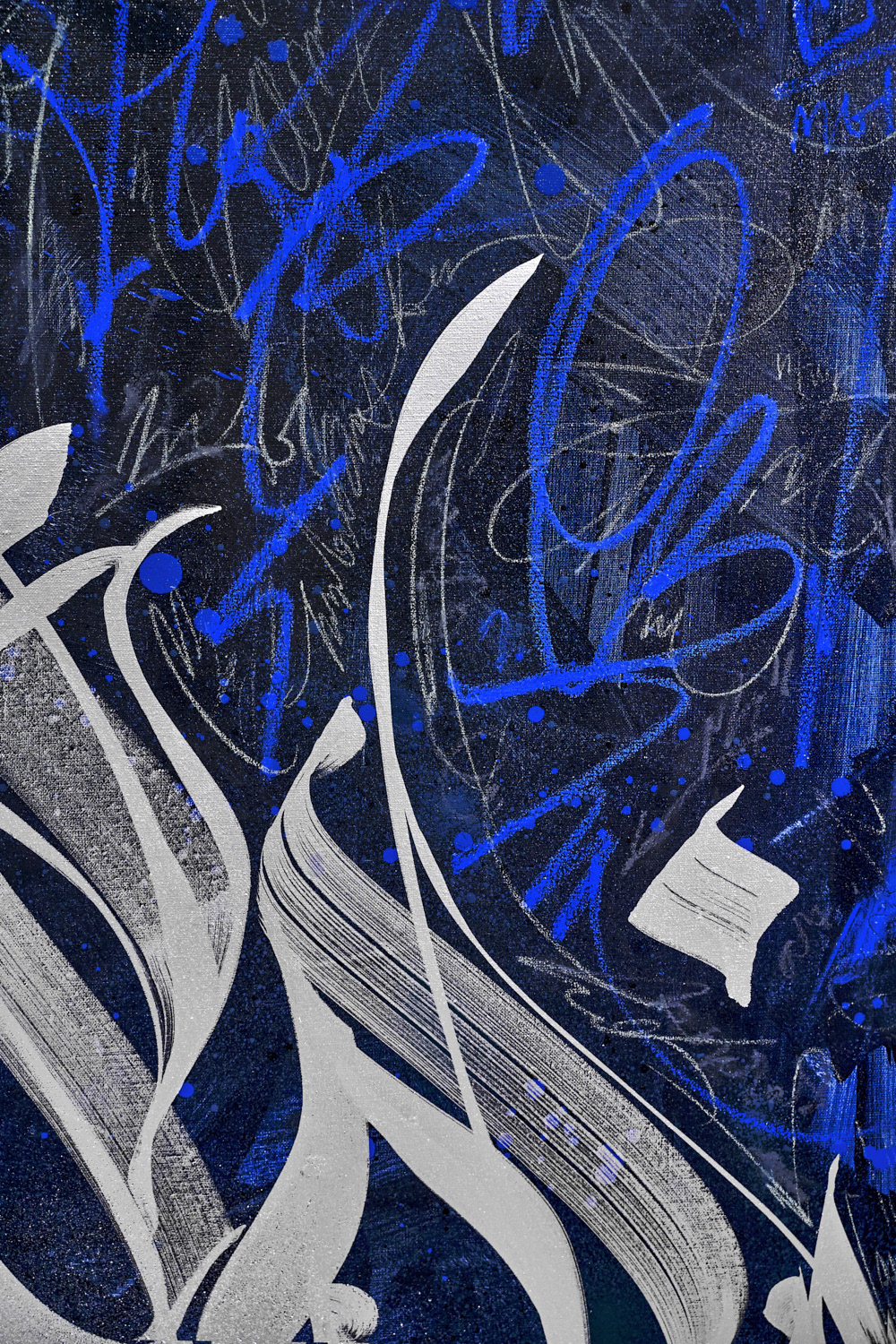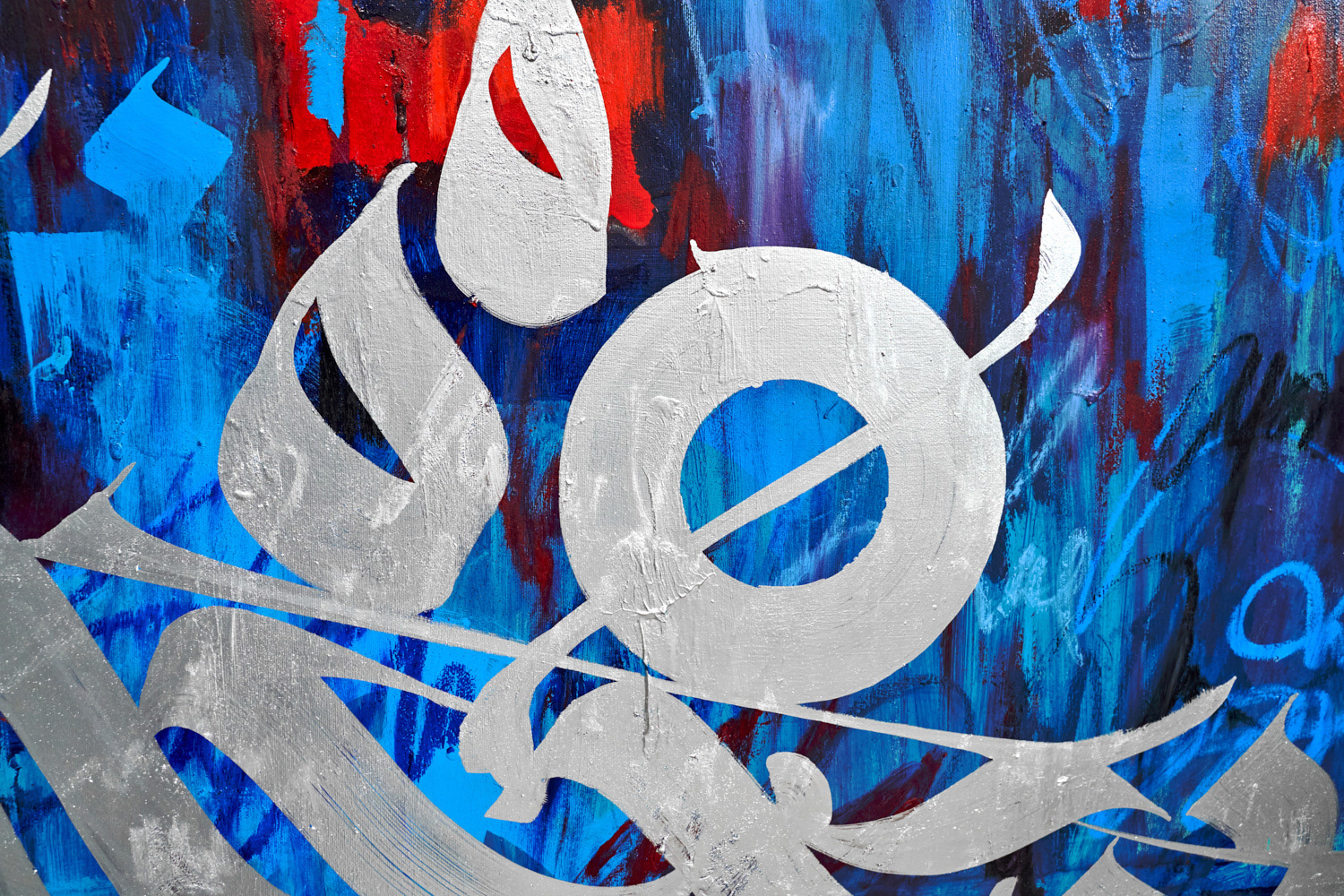 Acrylic paint, nitro paint, spray paint, silver paint on canvas. Mixed tech. 2019.