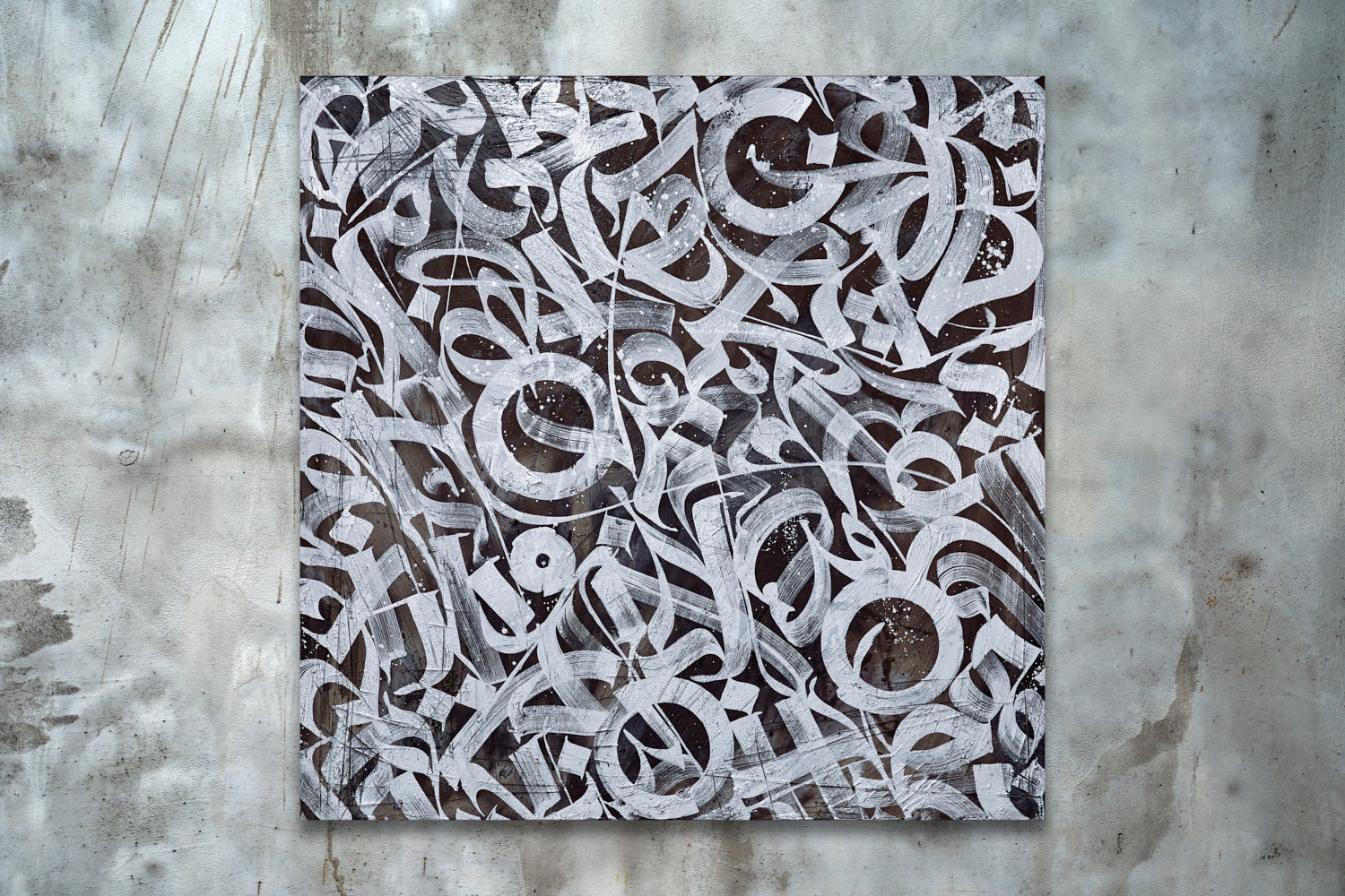 Custom concrete layer, acrylic paint, silver nitro enamel paint on canvas. Mixed tech. 2019.