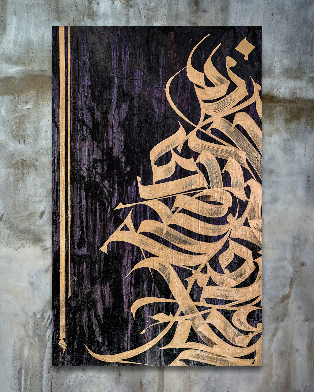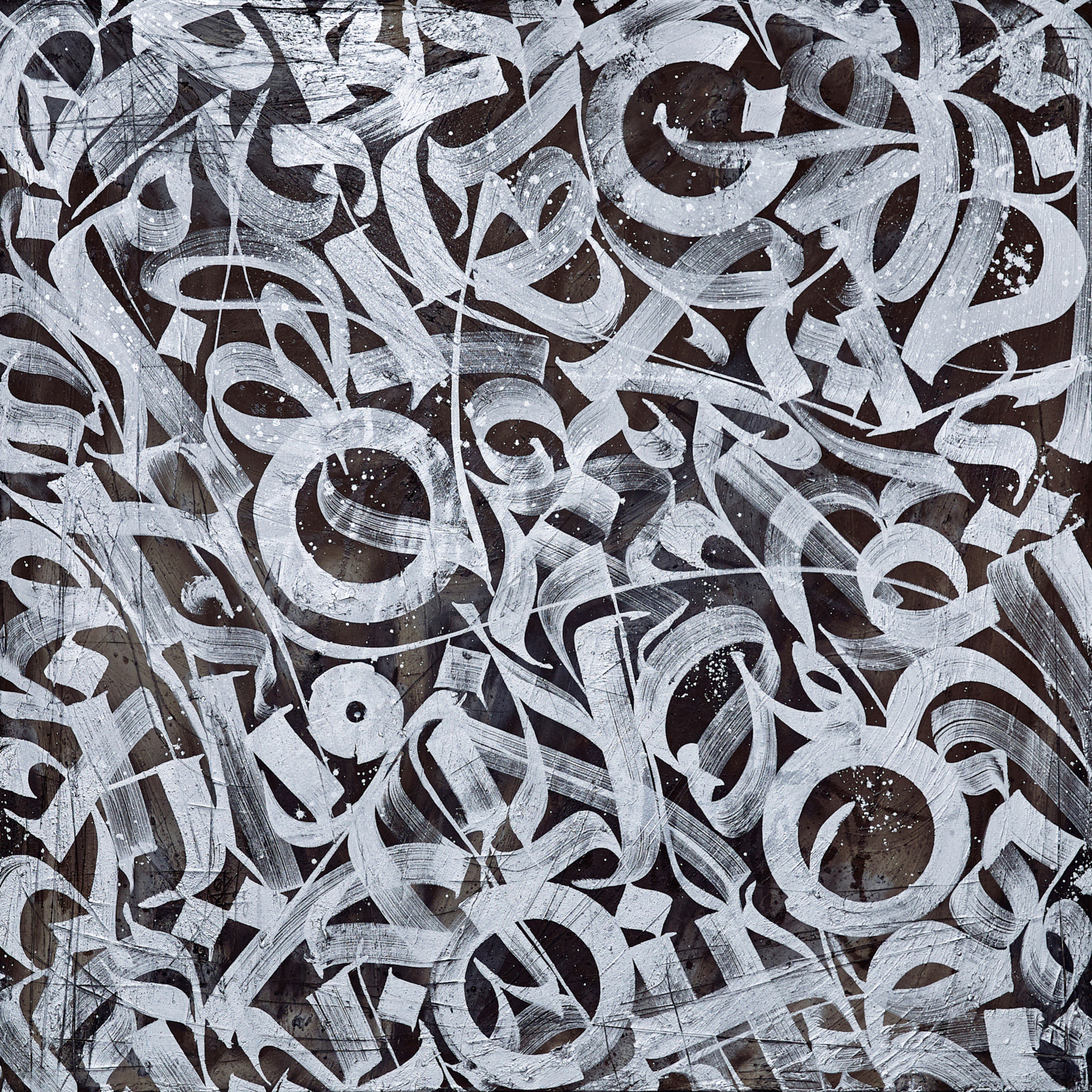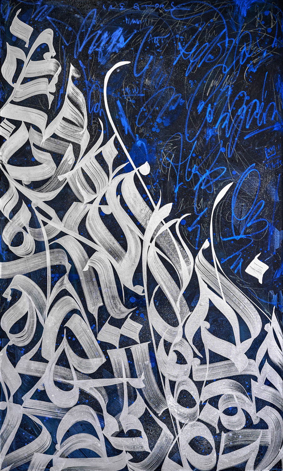 Exploration of the multi-layered artworks, based on the optical and conceptual deepness of the flat canvas surface. Each layer of calligraphy based on the parts of the artist`s memories and reflections about the culture, future, different generations and lettershapes.