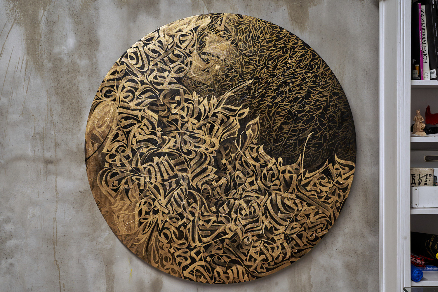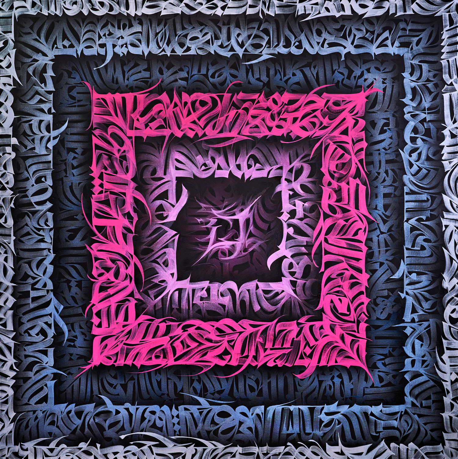 Exploration of the multi-layered artworks, based on the optical and conceptual deepness of the flat canvas surface. Each round of calligraphy based on the parts of the artist`s memories and reflections about the culture, future, different generations and lettershapes.