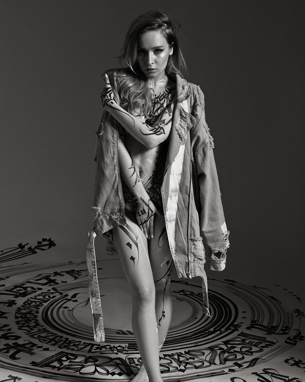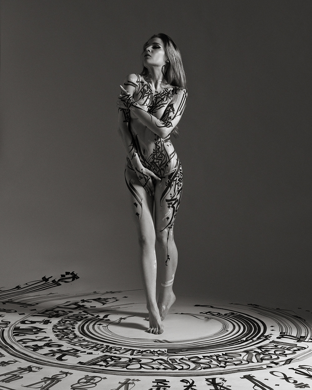 Я считаю, что искусство каллиграфии иначе раскрывает красоту женского тела, и здесь главное избегать пошлых ракурсов и кадров, ведь цель проекта — вдохновить, показать слияние искусства и тела, гармонию черного и белого, черной туши и нежной кожи.