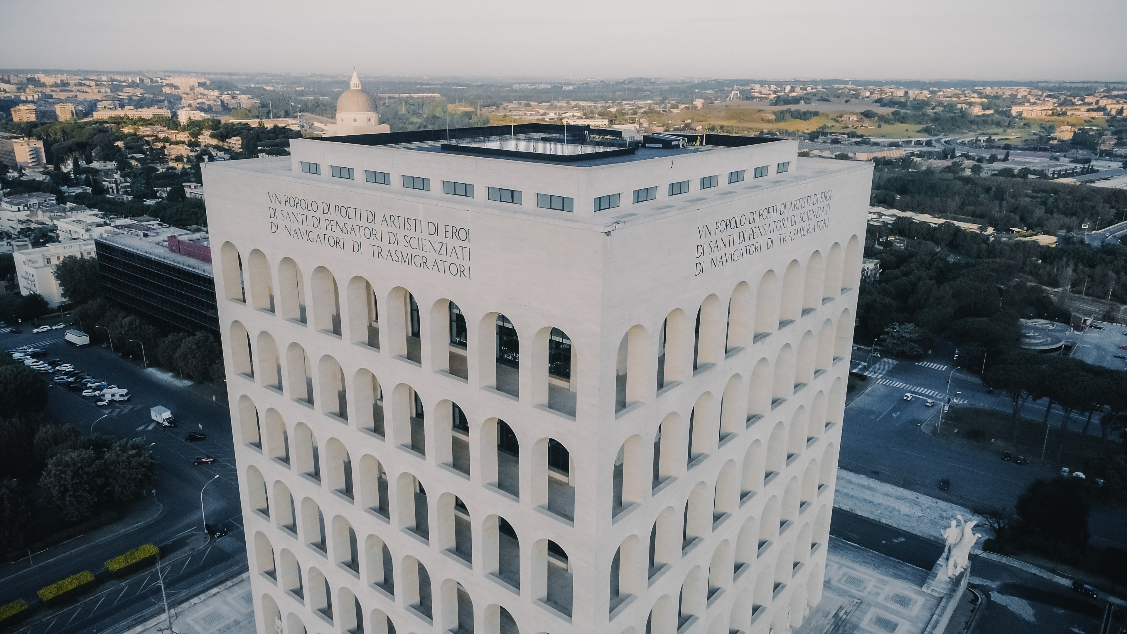 Оказалось, что крыша непростая — это легендарный "Colosseo Quadrato" — "Дворец итальянской цивилизации" или "квадратный колизей", являющийся монументальным памятником архитектуры и штаб-квартирой FENDI. Самое высокое здание Рима, построенное полностью из мрамора! И мрамор расписывать нельзя.