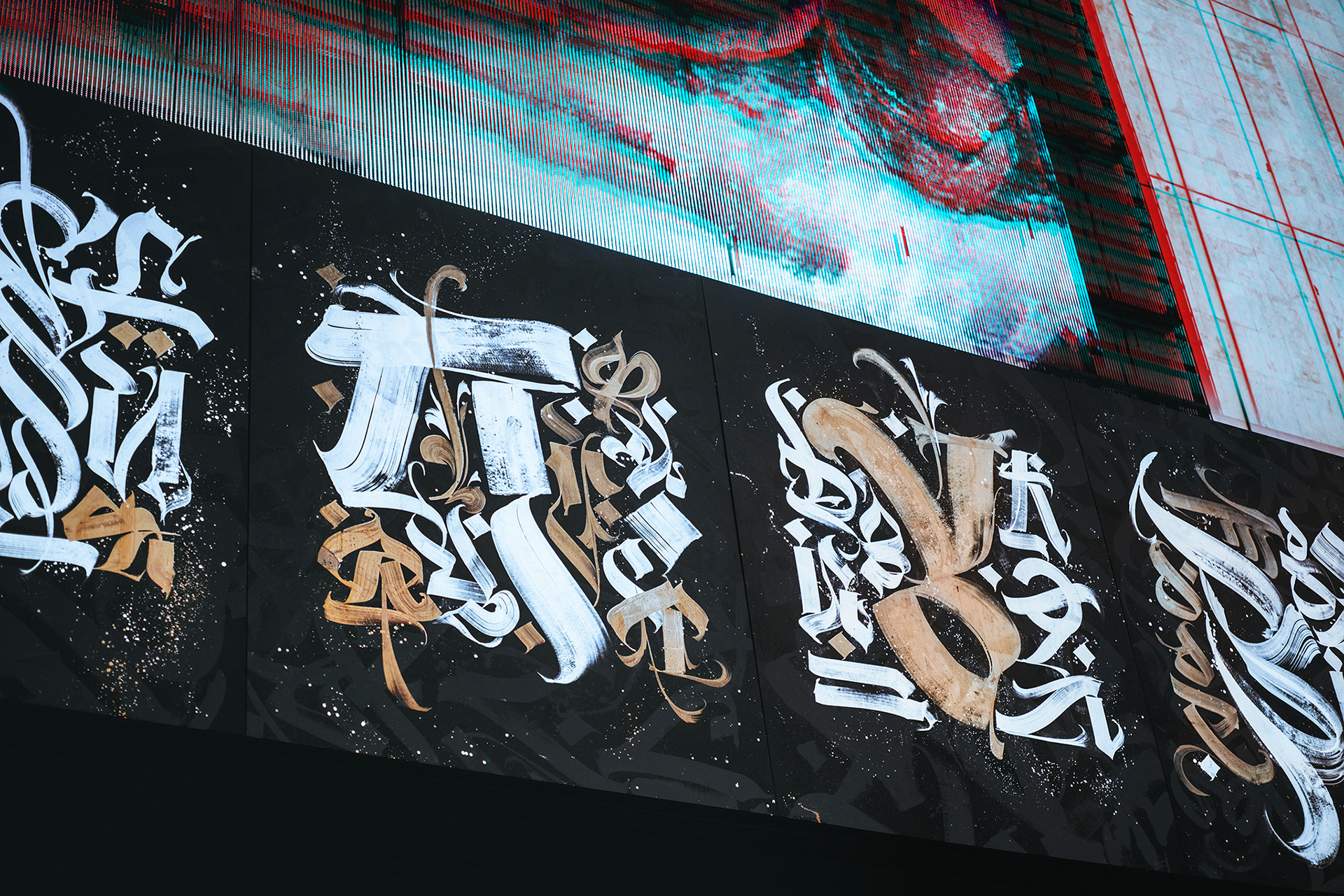 Based in the very heart of Moscow, this artwork spreading the encrypted words as the 22 huge pieces of the modern calligraphy artworks. Calligraphy based on the "Calligrafuturism" style developed by Pokras Lampas.